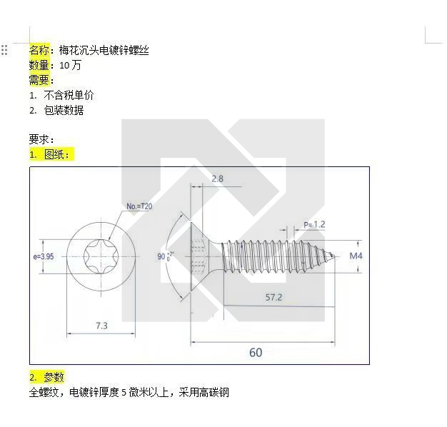 求购此款梅花沉头电镀锌螺丝